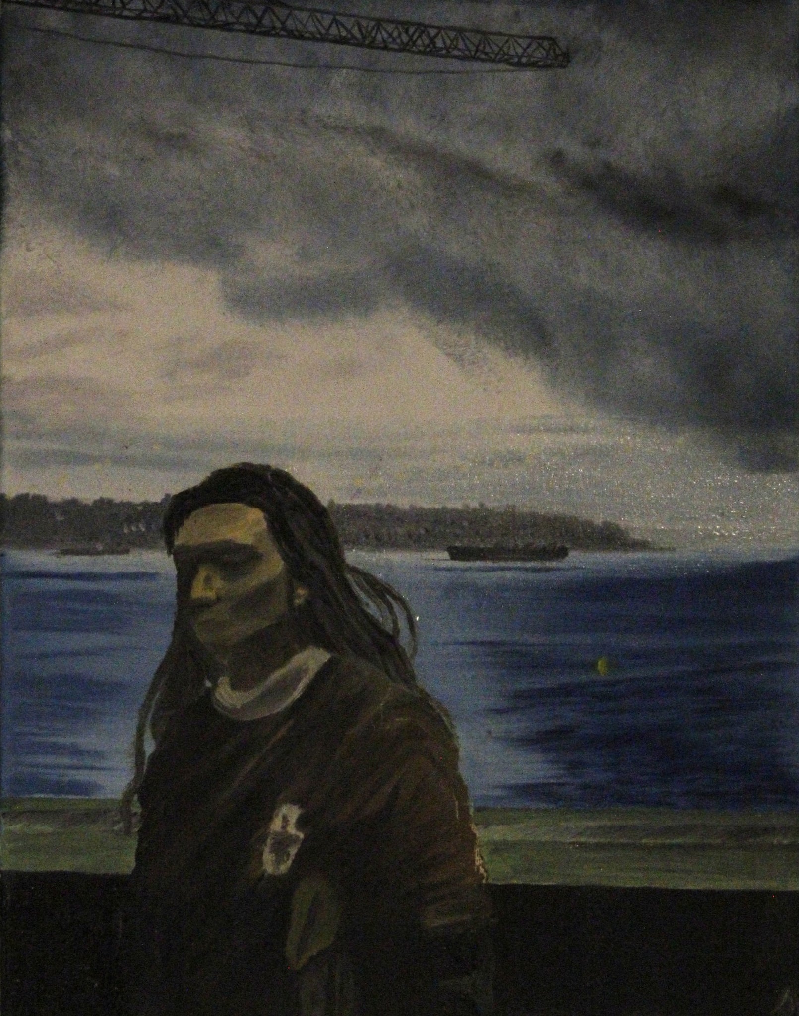 "Annus Cogitationis Magicae" (2025) is an oil on canvas painting by contemporary artist Jorge Hoolahan. The piece focuses on a woman in the foreground looking at the camera with what could be sadness or disgust, with Elliott Bay in the background.
