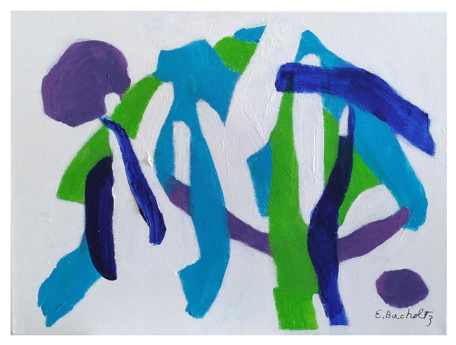 Acrylic on Canvas, light blue, light green, navy blue and purple, dancing shapes