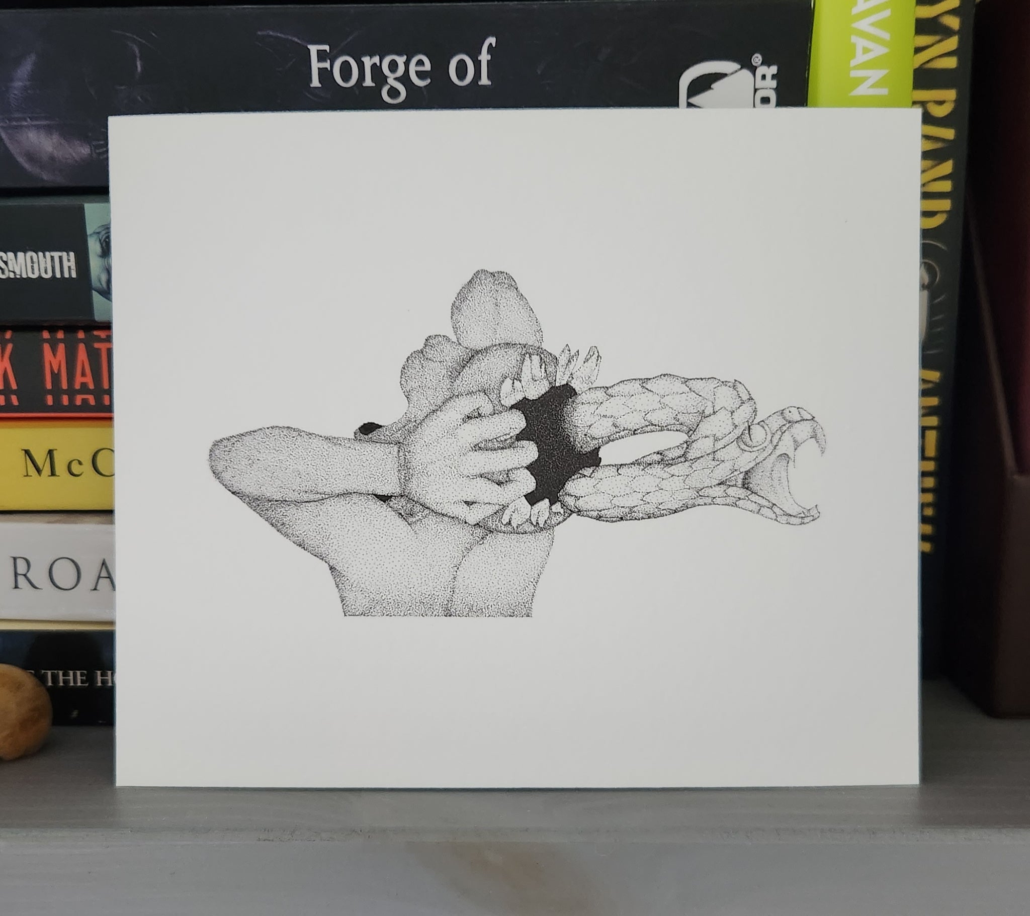 This print features a snake exploding out of a head, created by Sara Wells with fineline marker on paper. The drawing was made using only stippling. Printed on Hahnemuhle Photo Rag paper.