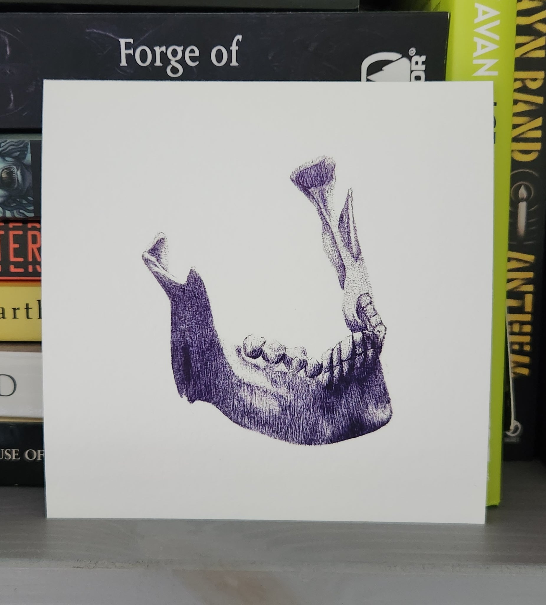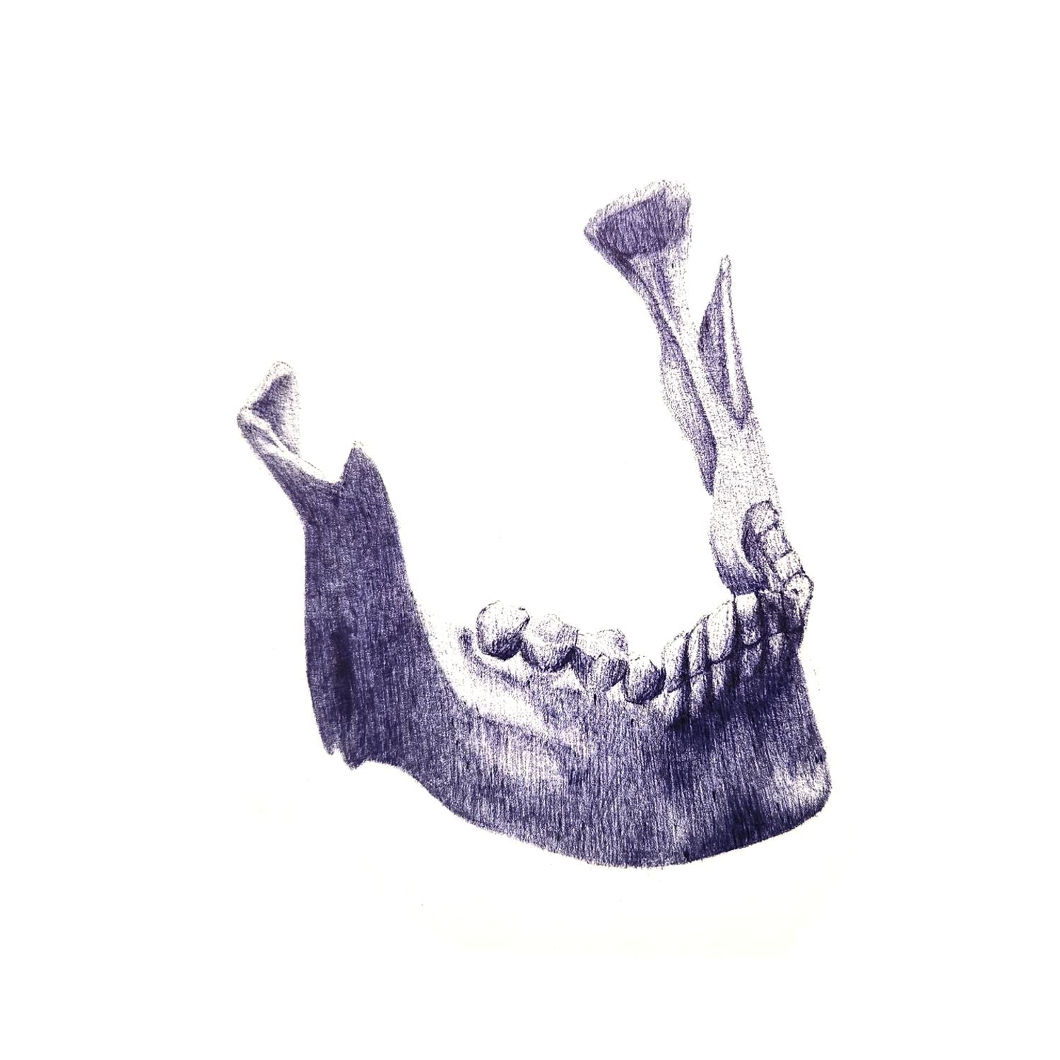 This print features a jawbone drawn by Sara Wells with ballpoint pen on paper. The drawing was made using only vertical lines. Printed on Hahnemuhle Photo Rag paper.