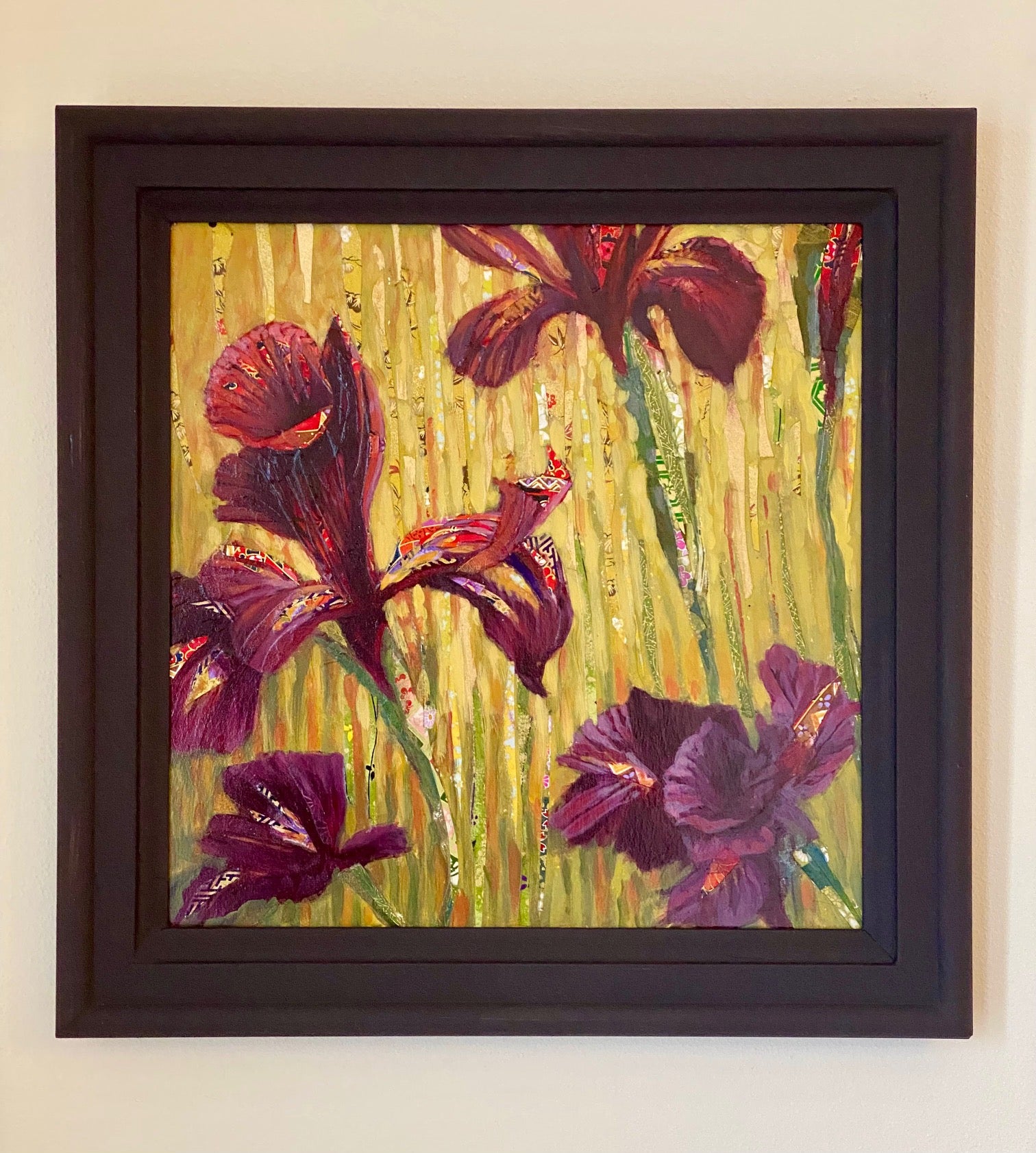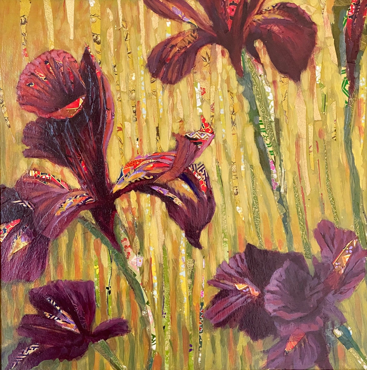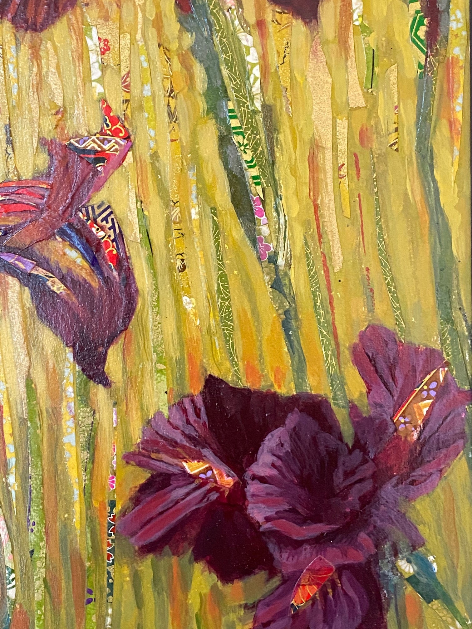This acrylic mixed media collage captures the fleeting brilliance of spring light as it moves across form and color. Deep violet irises unfold against shifting fields of gold and green, their petals illuminated by layered fragments of Japanese paper. The surface shimmers with both restraint and exuberance — a meditation on transition, on the brief moments when light lingers long enough to remind us of life’s vivid impermanence.