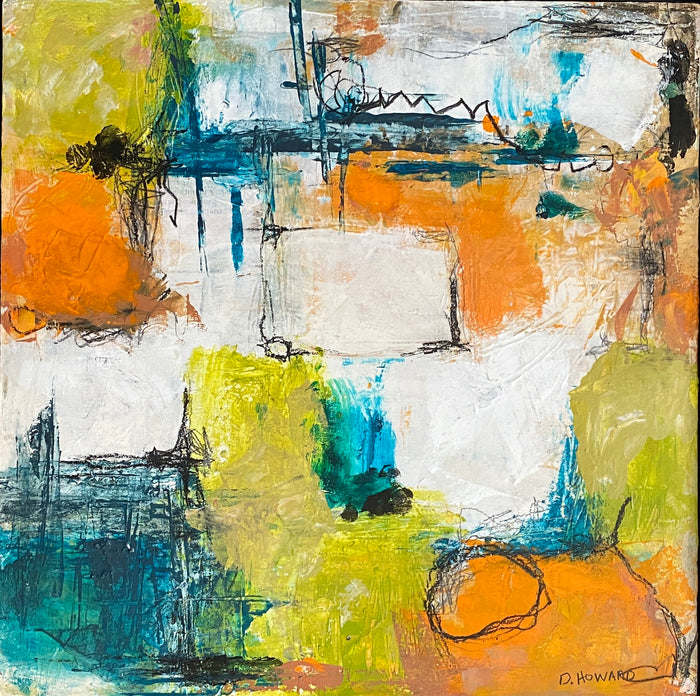 This painting has a variety of bold marks which hold up to the bold, intense colors. The scratchy marks are a nice difference from the soft edges of the colored shapes. I love the "boundaries" they give to the shapes. This painting would pair nicely with “Looking Back”. It is framed with a contemporary black floater frame,.