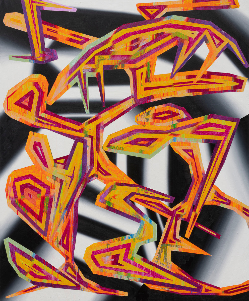 Drawing on outsider art sensibilities, and inspired by living in a city in the digital age, Zack describes his work as a search for balance within the 2D picture plane, fusing craft-oriented patterns, shapes, and motifs- to create abstract narratives for the viewer to mine visually.