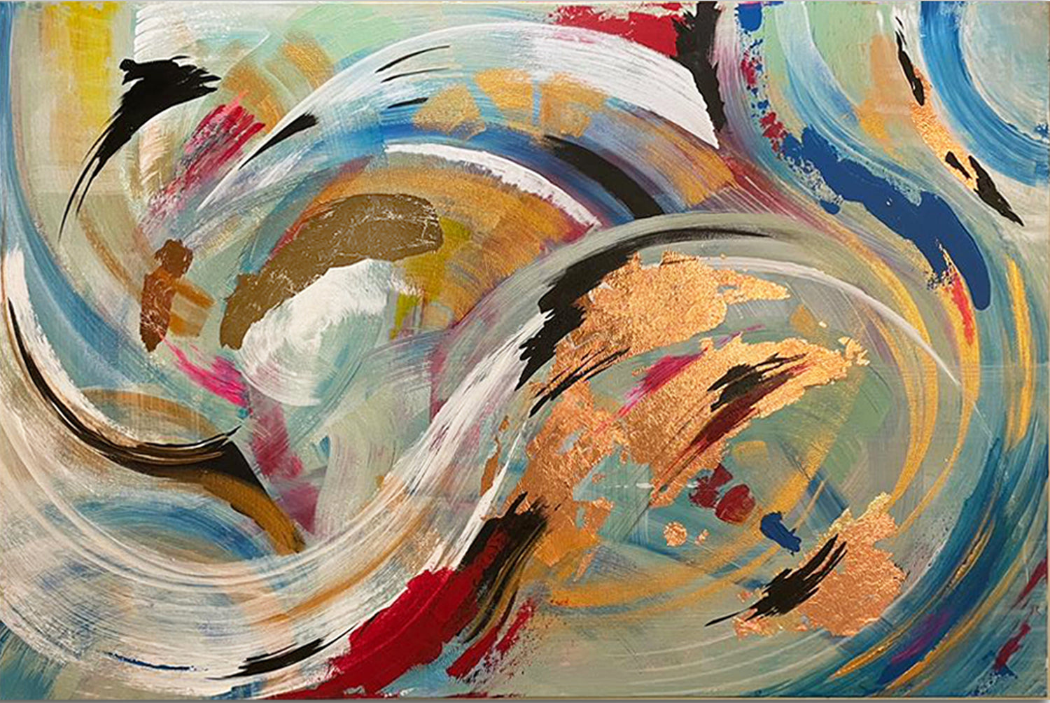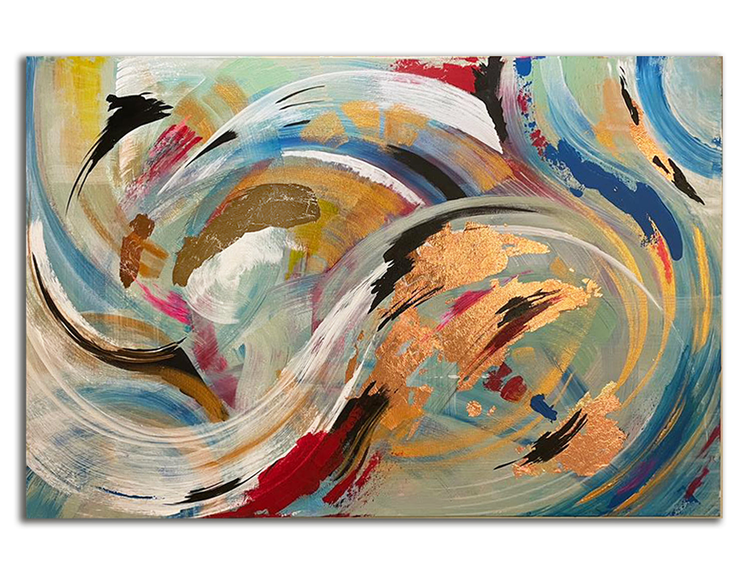 'Night out in Shoreditch’ is an abstract painting that attempts to capture the energetic and diversity of one of London’s most vibrant neighbourhoods. The addition of gold and copper leaf is a homage to the rich cultural heritage, reflecting the unique and eclectic style that makes Shoreditch a hub of creativity and culture.