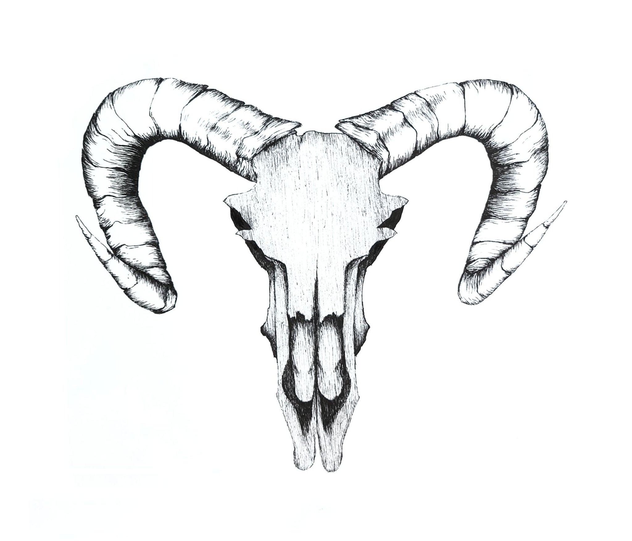 This print features a fantasy ram skull drawn by Sara Wells drawn with fineline marker on paper. Printed on Hahnemuhle Photo Rag paper.