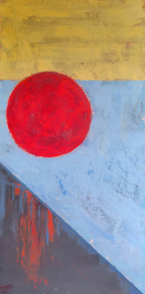 Color blocked painting showing a red orb ascending up into the golden yellow color.