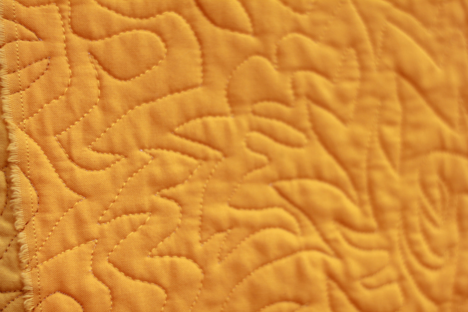 Warm gold floats above a vibrant red orange, featuring free motion quilting in a flame pattern.