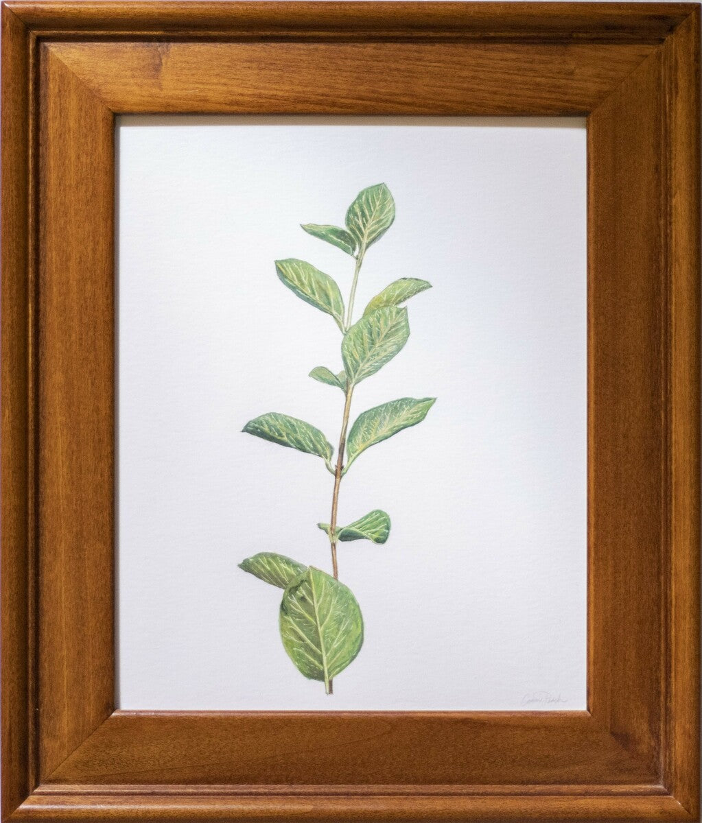 A mixed media acrylic ink and pencil painting of a simple spring leaf. Inspired by vintage botany illustrations with bright colors and a modern look. Original framed piece is signed by the artist and includes a certificate of authenticity, as well as UV resistant plexiglass (Acrylite OP-3) to protect the art over a lifetime. Original is an 8x10” piece on paper in a beautiful wood frame.